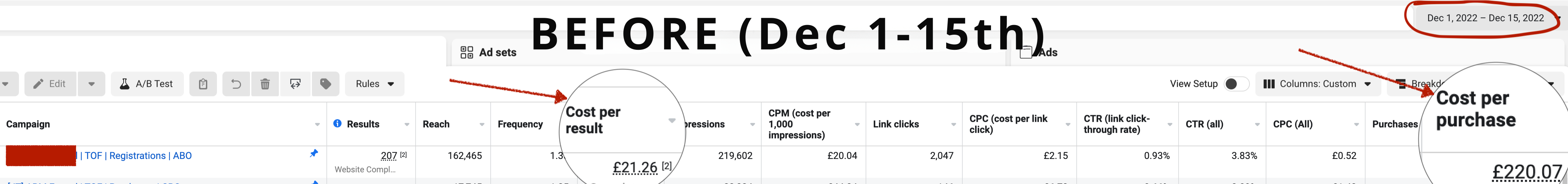 As shown below, during the first 2 weeks of December the cost per lead was as high as £21.26 and the cost per customer was £220.07: