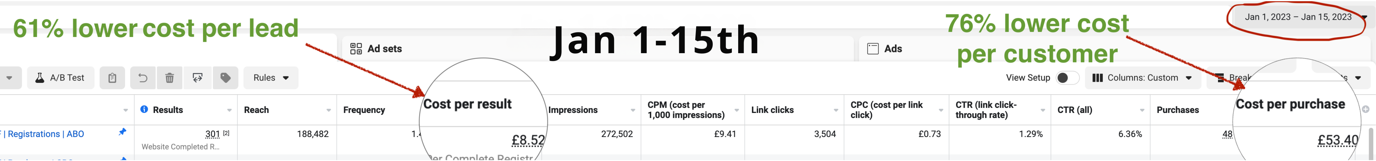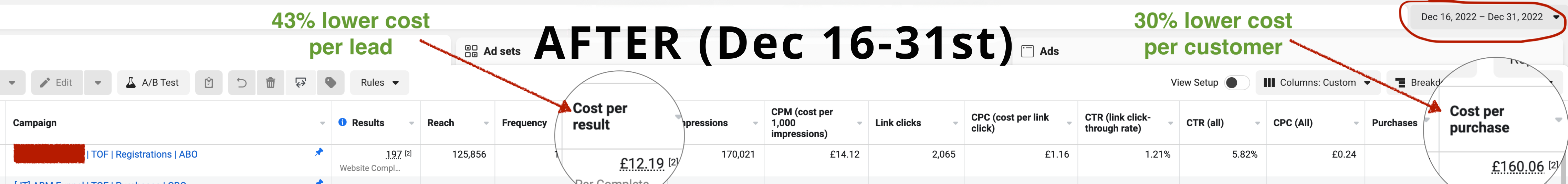 Cost per lead has been slashed by 43% and the cost per customer decreased by 30% in only 2 weeks (during the most expensive time of the year for running ads).